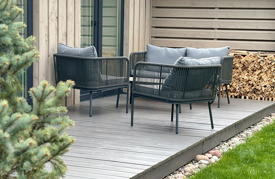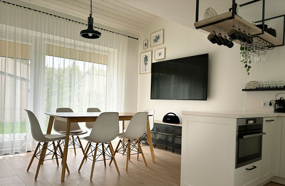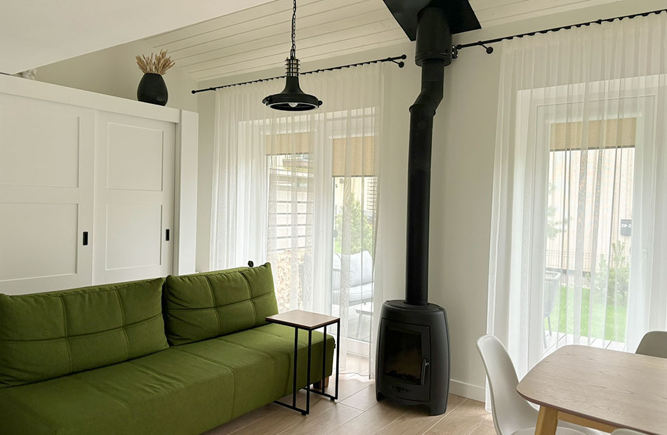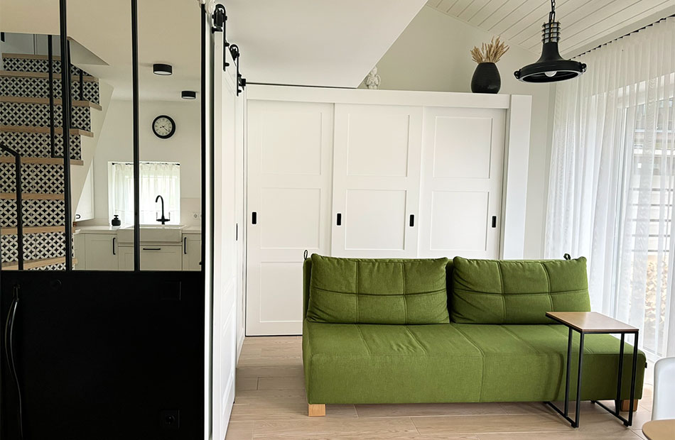 Pirmame aukšte svetainės zonoje yra sofa su integruotu miegamuoju mechanizmu. Gali miegoti 2 žmonės.