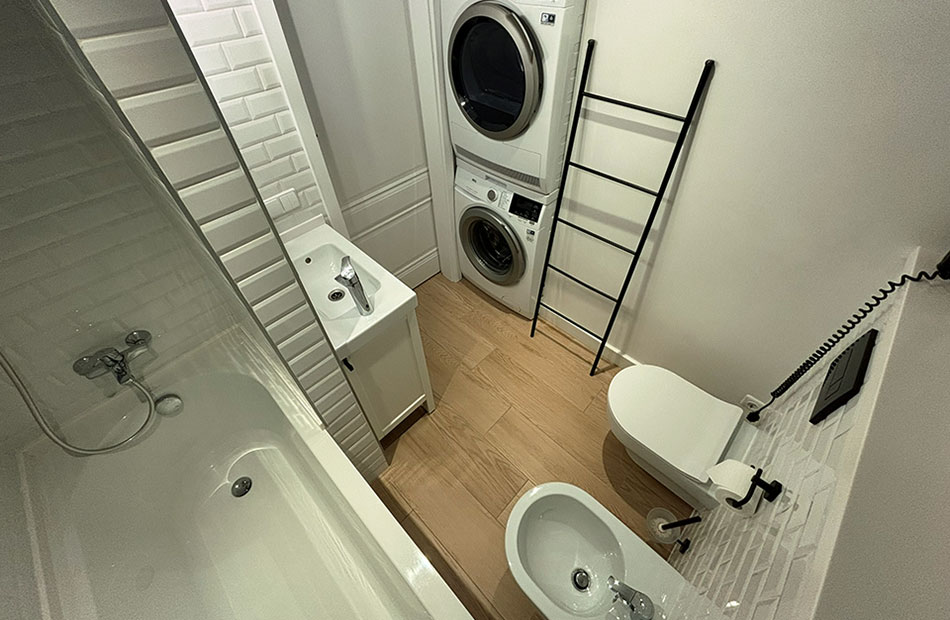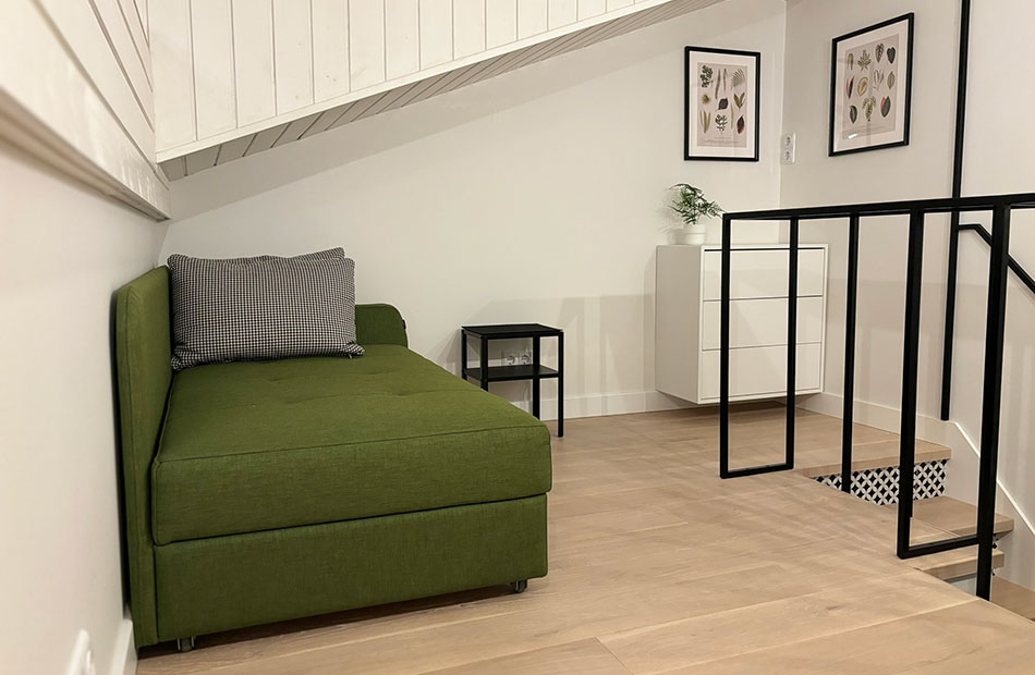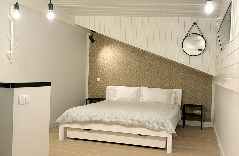 Mansardiniame kambaryje antrame aukšte yra kušetė. Gali miegoti 1 žmogus.